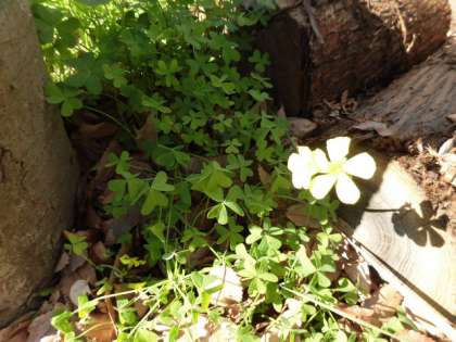 ケヤキの根元に目を移すと、森の片隅の陽だまりで、黄色いオキザリス(オオキバナカタバミ)の花が揺れています。
