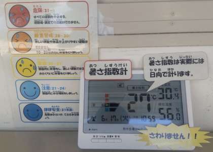 子ども達が、自分達でも気を付けるように、職員室前には暑さ指数計を設置し、保健室前には現在の暑さ指数を掲示しています。