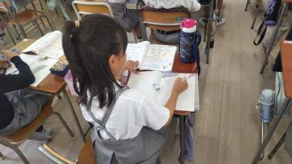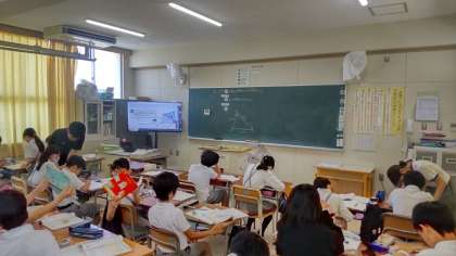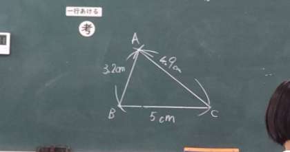 合同な三角形の作図を活用して、合同な四角形を描く学習の様子です。
