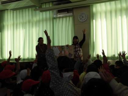 今日は、子どもたちが楽しみにしている「ハッピー・タイム」の日でした。雨上りで運動場が使えないこともあり、たくさんの子どもたちがやってきました。