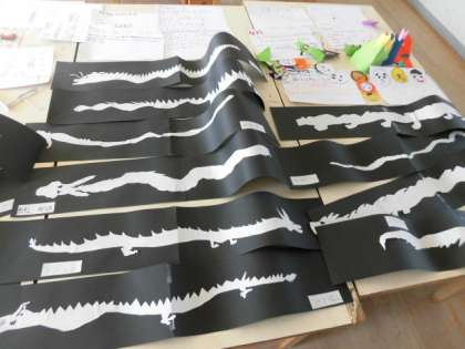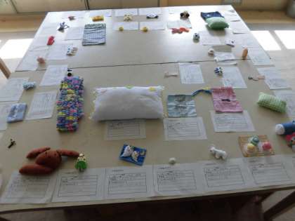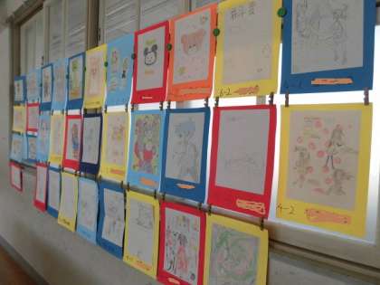図工室で、マンガクラブ、工作クラブ、手芸クラブが、作品を展示しています。