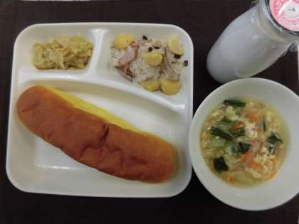 中華おこわ、卵スープ、キャベツのオイスターソース炒め、パンプキンパン、牛乳 でした。