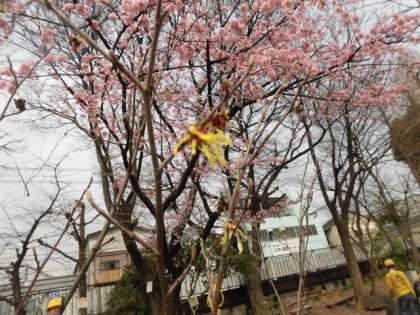 【写真上】早くも満開の桜をバックに咲く、「マンサク」です。春になるといち早く花をつけることから「まず、咲く」⇒「マンズ・サク」⇒「マンサク」と呼ばれるようになったそうです。
