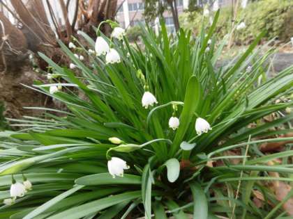 【写真下】森の片隅の目立たない場所で、可憐に咲いている「スズランスイセン」です。「スノーフレーク」とも呼ばれます。真っ白な花色に、グリーンのドット柄がとってもかわいいです。