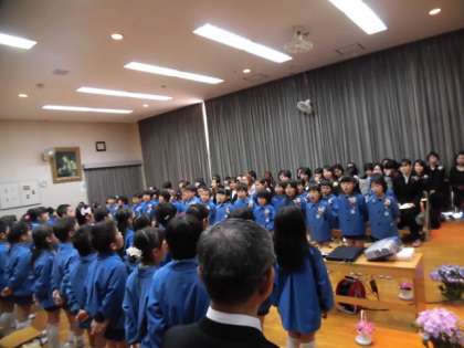 きく組さん、すみれ組さんの57名が修了証を受け取り、一人一人幼稚園の思い出を発表しました。みんなとっても行儀よく、立派な態度で式に臨んでいました。