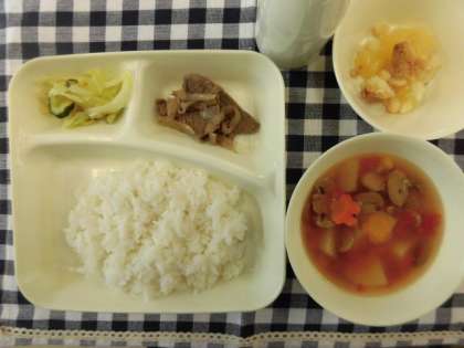 サーロインのペッパー風味、トマトスープ、キャベツときゅうりのピクルス、りんごのクランブル、ごはん、牛乳 でした。