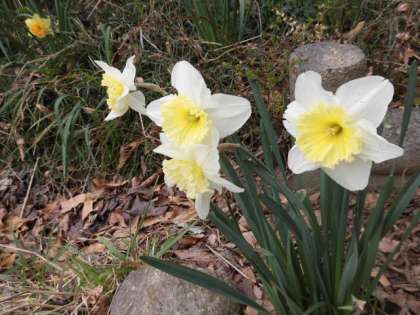 冬に咲いていたスイセンはすっかり花期を終え、白い「ダイカップスイセン」と、オレンジの「ニホンスイセン」が美しく咲いています。