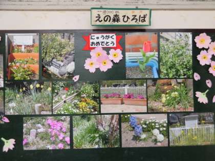 理科室前の掲示板「えの森ひろば」も模様替え。春の写真がいっぱいです。