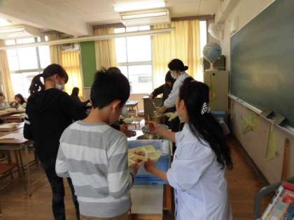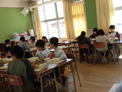 本校の学校給食は、大阪市が民間業者に委託し、学校の給食室で調理していただいています。民営化から3年が過ぎ、契約の更新を迎えた今回、給食試食会を行いました。入学式準備を終えた6年生のうち、希望者が参加しました。試食会の献立は、