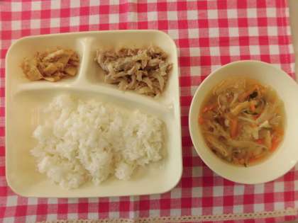 豚肉のしょうが焼き、すまし汁、ごまかかいため、ごはん でした。