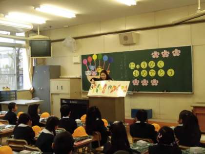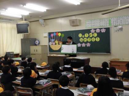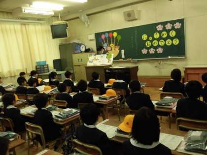 入学式が終わり、講堂で保護者の皆様への説明を行っているあいだ、1年生は各教室で、絵本を読んでもらったり手遊びをしたりして過ごしました。