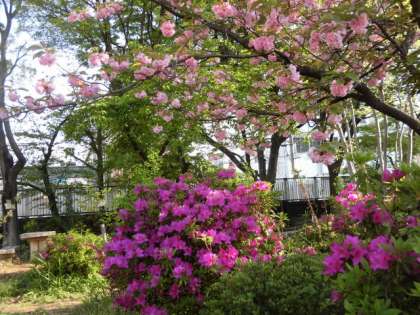 まだまだ見頃のボンボリのようなサクラの下で、ツツジやサツキが咲き競っています。