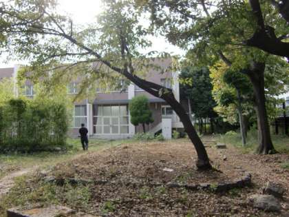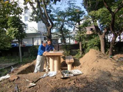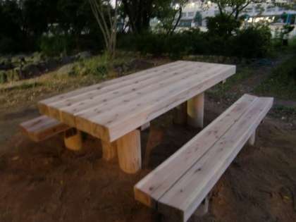 桜の木以外を伐採した築山に、木製のテーブルとベンチを置きました。