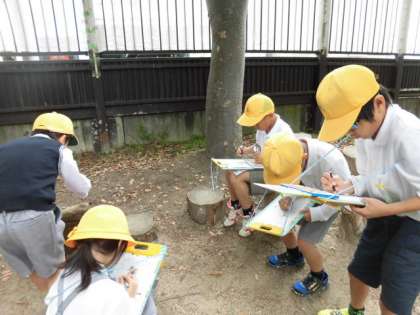 えの森の植物や昆虫など、虫めがねも使いながら観察し、丁寧に観察カードに書き込んでいました。