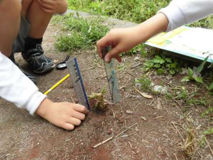 「タケノコがはえてる!!」と大発見。竹林から地下茎が伸び、通路ににょっきりと顔を出したようです。「写真を撮ってください!」と言うので、大きさがよくわかるよう定規を添えて撮影しました。