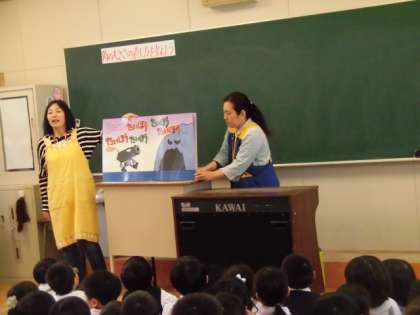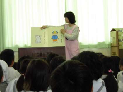 月に1回、ボランティアの方々が、本の読み聞かせに来てくださいます。今日は雨で運動場が使えなかったこともあり、たくさんの子どもたちがお話を聴きにやってきました。