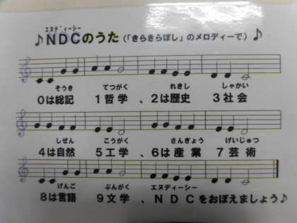 図書室で、楽しい歌の楽譜を見つけました。「NDCのうた」という歌だそうです。この歌を覚えると、図書館で本を見つけるのが易しくなるかもしれませんね。