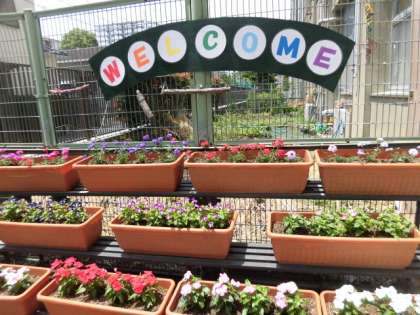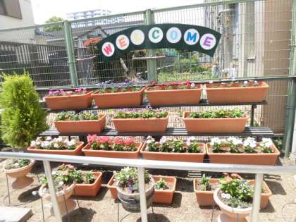 正門を入ったところのウエルカムガーデン。冬に植えて長らく目を楽しませてくれたノースポールやデイジー、ビオラも花期を終え、夏の花に模様替えしました。