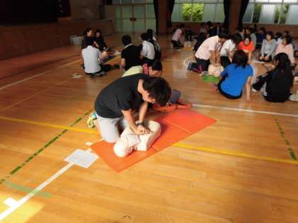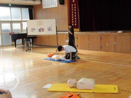 学校では年に1回必ず、救急救命講習会を実施しています。応急手当普及員の副校長が講師となり、全教職員で、心肺蘇生(胸骨圧迫、人工呼吸、AED)、気道異物の除去、止血法等について訓練しました。
