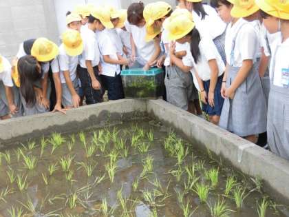 カエルがスイスイ泳ぐ田んぼのある学校で学ぶ子どもたち。大人になってから、「なんて幸せな環境で学んでいたんだろう」と、再認識してくれることと思います。