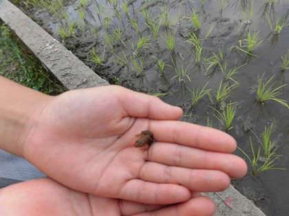 昨日田植えを終えた田んぼに、職員室前で飼っていたカエルを放しました。