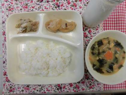 鶏肉の甘辛焼き、みそ汁、キャベツの赤じそあえ、ごはん、牛乳 でした。