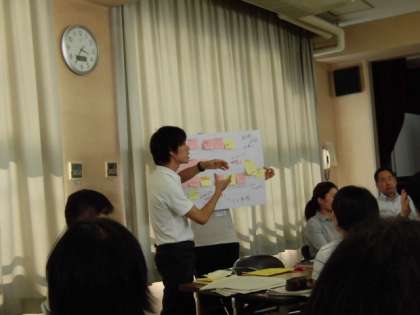 研究授業で感じたこと、改善できる点などを付箋に書き出し、授業の「焦点化」「視覚化」「共有化」、学習環境の整備、個別の配慮やしかけ、という、研究の柱に沿って班ごとに協議します。よりよい授業づくりに向けた真剣な話し合いの後、班ごとに協議のまとめをプレゼンテーションするというのが、本校の研究討議のいつもの流れです。
