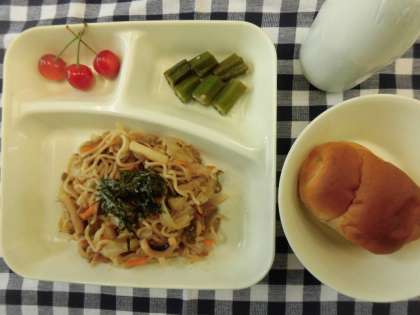 焼きそば、オクラの中華あえ、さくらんぼ、黒糖パン、牛乳 でした。