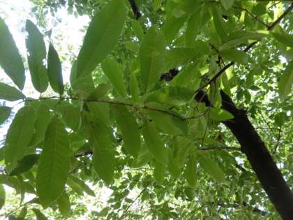 【写真上】去年、大きなドングリをたくさん落としてくれたクヌギ。写真の真ん中あたりをよ〜くご覧ください。まだ小さく、緑色ですが、殻斗(ドングリの帽子の部分)ができてきています。