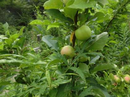 【写真中】姫リンゴが少しずつ色づいてきました。縁日のリンゴアメがつくれそうな、きれいな赤いリンゴになります。
