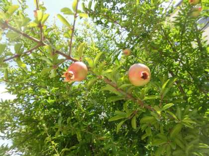 【写真】ザクロはオレンジの花を終え、実がなりだしました。ザクロは敷地内に3本あります。花も実も美しく、目を楽しませてくれます。