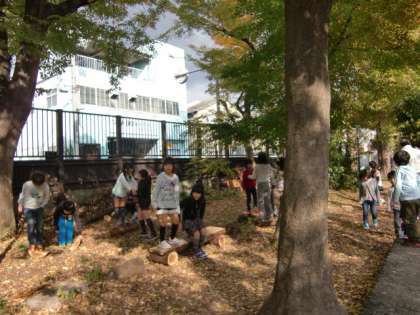 一本橋では、順番に並びながらも、小さい1年生を先に渡らせている姿も見られました。ベンチで語らっている子や、担任の先生へのお土産にと、きれいな落ち葉を選んで拾っている子。みんな生き生きしていました。