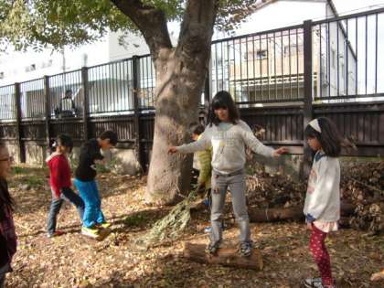 半分に切った丸太をひっくり返して、ぐらぐらバランスをとったり、ゆらゆら一本橋のように渡ったり。自分たちで遊びを発見し、とっても楽しそうでした。