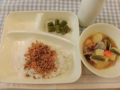 豚肉とじゃがいもの煮もの、オクラの甘酢あえ、紅ざけそぼろ、ごはん、牛乳  でした。