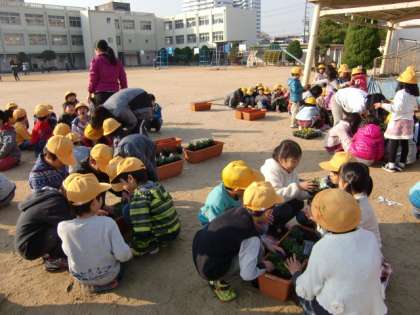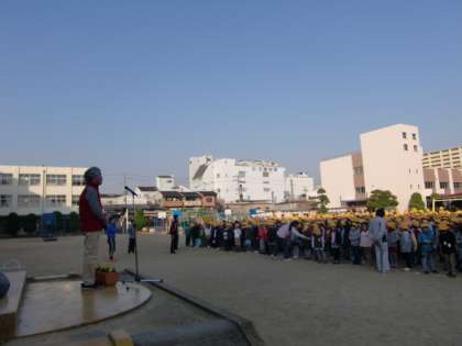 児童朝会で、届けてくださった園芸業者さんに、苗の植え方、育て方のレクチャーをしていただきました。