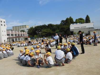 集会の最後に、今日から3週間、保健の先生になるために勉強に来ている教育実習生さんが紹介されました。「よろしくお願いします」のあいさつと温かな拍手があり、和やかな雰囲気で運動場を後にしました。