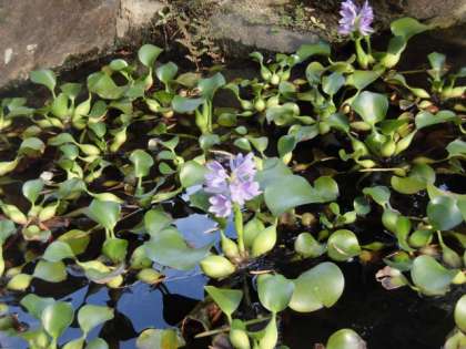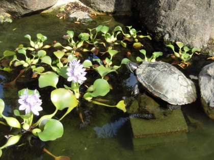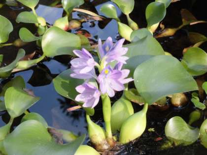 亀池で、淡いブルーのホテイアオイが咲きました。