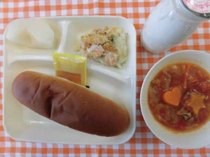 えびグラタン、トマトスープ、二十世紀なし、大型コッペパン、牛乳、あんずジャム