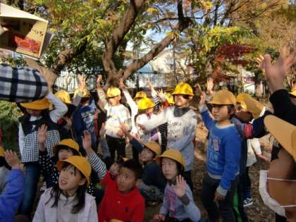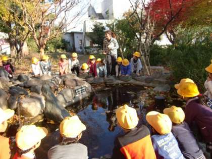 いいお天気です。今日はえのもとの森で授業をすることにしました。まず、池をのぞいてみました。ニッポンバラタナゴが見当たらないので、子どもたちに目を瞑ってもらい、池に魔法をかけました。「ちちんぷいぷい、えーい!」するとなんと!!バラタナゴが現れたではありませんか!!(実はえさをまいただけ)「みーつけた!」と子どもたちは大喜びです。