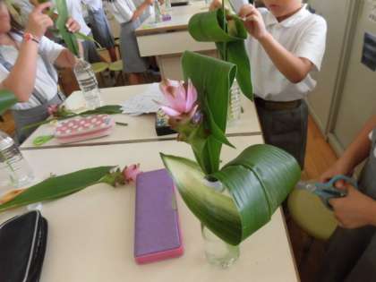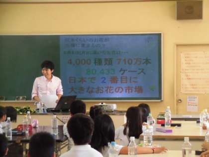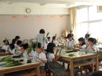 花の流通についてなど、3年生にもわかりやすく興味深いお話に続いて、一花一葉(いっかいちよう)のフラワーアレンジメントの体験をしました。