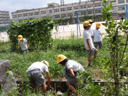 オンブバッタやコオロギは、探す必要がないほどたくさん姿を見ることができます。子どもたちは、作物を栽培している学習園に足を踏み入れないよう気を付けながら、真剣な表情で虫を追っています。