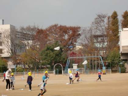 えのもとの森をバックに、元気いっぱい走り回って、自分の作った凧を揚げるのに、夢中になっていました。(なかには、凧をひきずりながら走っている子も・・・)