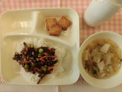 もずくと豚ひき肉のジューシー、五目汁、あつあげのしょうがじょうゆかけ、牛乳 でした。