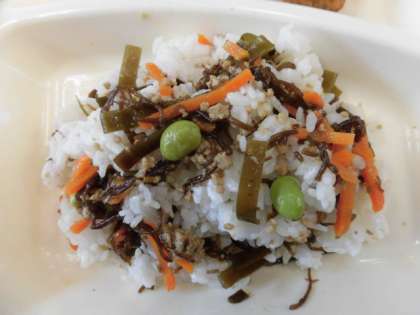 「ジューシー」は沖縄の方言で、「炊き込みご飯」「雑炊」などのことを言います。もずくや昆布、豚ひき肉がたっぷりです。今日の給食では、ご飯の上に具を乗せ、混ぜ合わせていただきました。