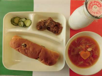 ミラノ風カツレツ、ミネストローネ、きゅうりのサラダ、レーズンパン、牛乳 でした。