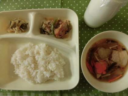 鶏肉のごまだれ焼き、ソーキ汁、チンゲンサイともやしの甘酢あえ、ごはん、牛乳 でした。