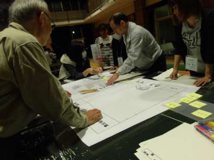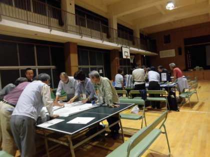 卓球台の上に広げられているのは、榎本小学校の敷地と講堂の図面です。受付をどこにするか。避難してくる様々な事情を抱えた方をどのように誘導するか。など、グループごとに話し合い、避難所運営のルールを確立させていきます。