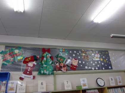 図書室後ろの素敵な壁面掲示も、ハッピータイムさんの作品です。読み聞かせだけでなく、掲示物による雰囲気づくりや、傷んだ図書の修理など、子どもの読書環境の充実のために、いつもお世話してくださっています。