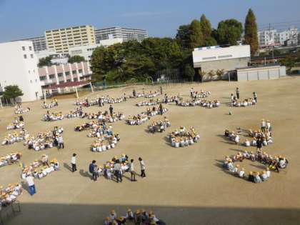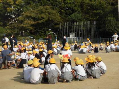 運動場いっぱいに読み聞かせの輪ができ、全員がお話の世界に魅入られているかのようです。