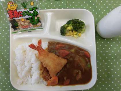 えびフライカレーライス、ブロッコリーとコーンのサラダ、豆こんぶ、牛乳 でした。